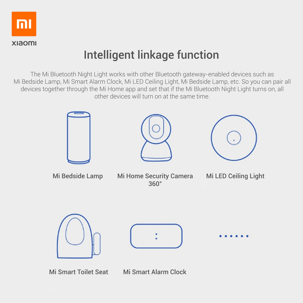 The Mi Bluetooth Night Light works with other Bluetooth gateway-enabled devices such as Mi Bedside Lamp, Mi Smart Alarm Clock, Mi LED Ceiling Light, Mi Bedside Lamp, etc. So you can pair all devices together through the Mi Home app and set that if the Mi Bluetooth Night Light turns on, all other devices will turn on at the same time.