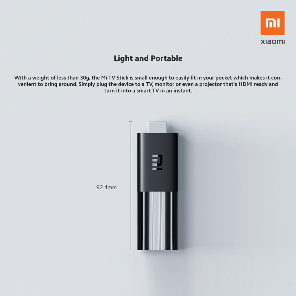 with a weight of less than 30g, the Mi TV Stick is small enough to easily fit in your pocket which makes it convenient to bring around. Simply plug the device to a TV monitor or even a projector thats HDMI ready and turn it to a smart TV in an instant.
