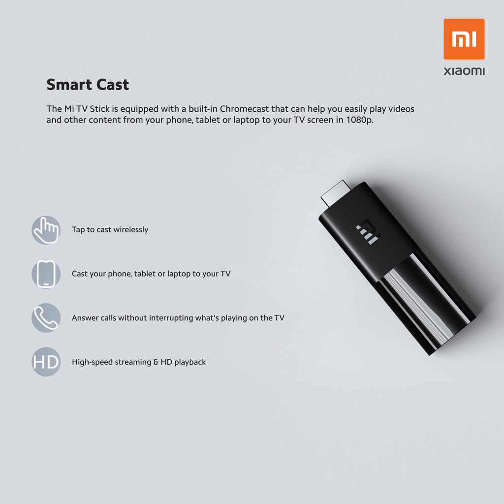 The Mi TV Stick is equipped with a built-in Chromecast that can help you easily play videos and other content from your phone, tablet and laptop to your TV screen in 1080p.